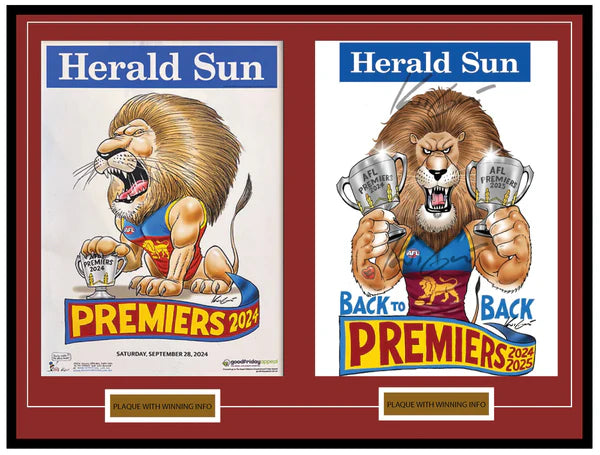 Celebrate the Brisbane Lions’ historic back-to-back AFL Premiership wins with this exclusive framed memorabilia display, featuring the 2024 and 2025 official Mark Knight Premiership Posters side by side.
