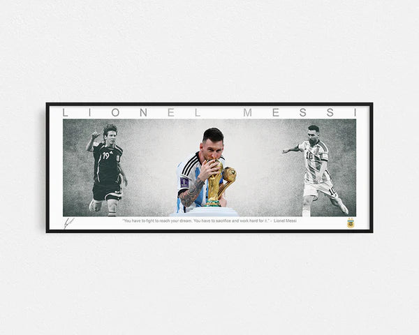 Celebrate the historic triumph of Lionel Messi and Argentina at the 2022 World Cup with this panoramic framed print. Showcasing a detailed, wide-angle view of key moments from the tournament, this expertly crafted piece captures Messi’s legendary performance and his team's victorious journey. Designed for collectors and enthusiasts, it offers a premium presentation that enhances any space while honoring one of football’s greatest achievements.